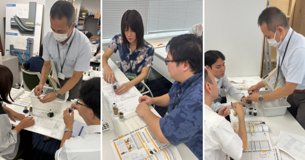 続いて、カタログを使った継手の選定・接続体験へ。テーパーねじや平行ねじなど、種類ごとの特徴を学びながら、実際に手を動かして接続を試みることで、図面上の記号が“現場でどう使われるか”を具体的に理解することができました。