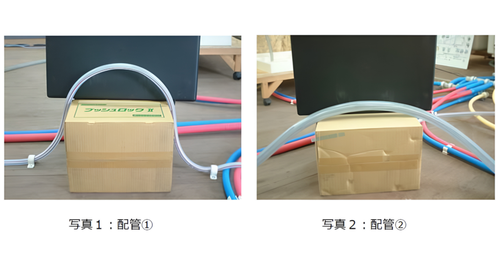 研修では、立ち上がりの高さが高くなるほど、残留エアを押し出すために必要な流水量(=開栓時間)が多くなることを実際の検証結果をもとに学びました。設計時にこうした現象を考慮することで、使用時の不具合を防ぎ、住まわれる方の快適さにつながる設計が可能になります。